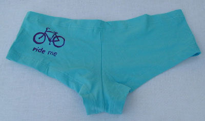 Now I don't know much about female cycling apparel, but I reckon these don't look like they'd wear too well in the saddle… I mean, I think they look great and the "ride me" slogan with the bike logo is a positive cycling message but there's a distinct lack of padding around the rear end. And wouldn't they tend to give you a wedgie?